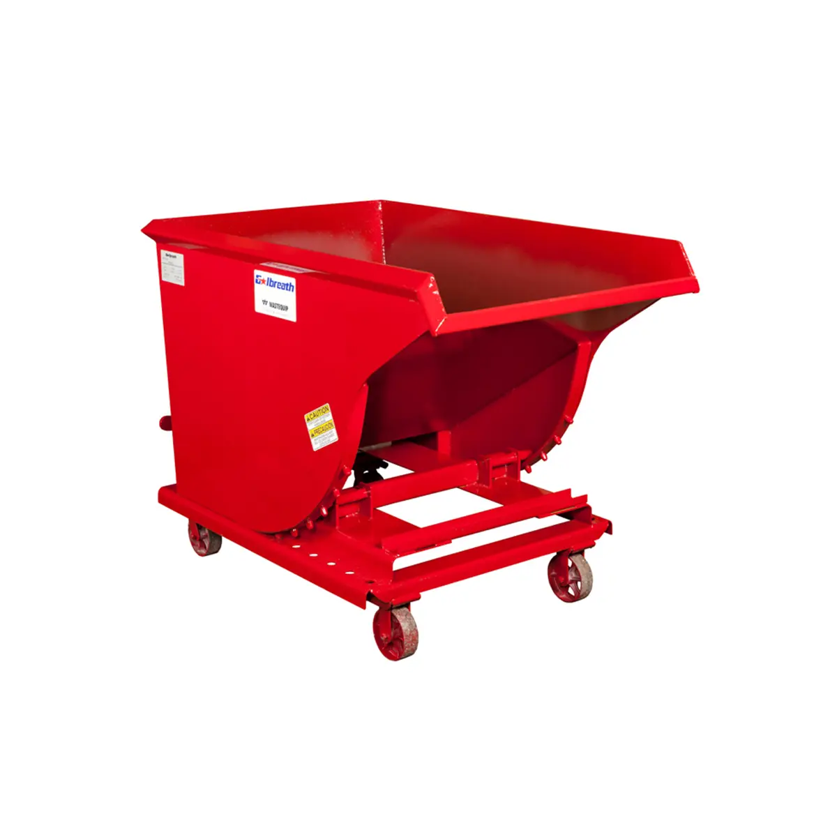 The 7-gauge steel body features a channel for additional support on the hopper body and an angle-reinforced formed steel base with 1” plate rocker stops. Rocker allows the hopper to roll forward and backward for easier dumping with the pull of a handle. Rocker stops lock the hopper in place for safety.